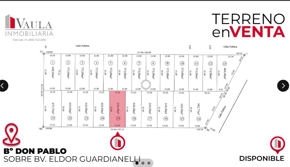 TERRENO A LA VENTA SOBRE Bv. ELDOR GUARDIANELLI - 13.50 x 31,00m = 418,50M2